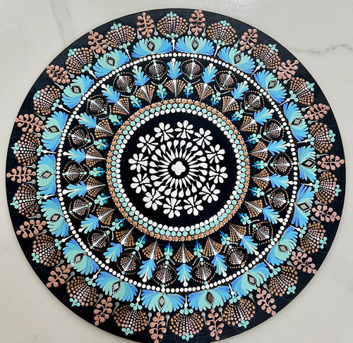 Size: 24 inch (Base) with 12 inch hand painted scenic view in centerBase: MDF board, resin-coatedMedium: Acrylic and dot mandala art Where waves whisper calm and colors breathe peace — a mandala that captures therhythm...