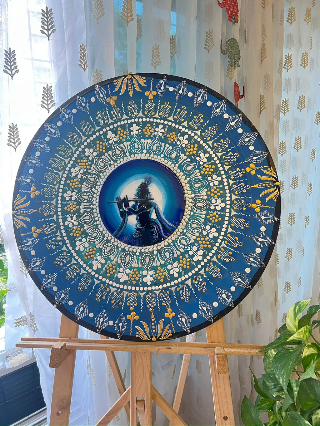 Size: 24 inchesBase: MDF with resin-coated Krishna in the centre A beautifully hand-painted dot mandala surrounding a resin-finished Krishna artwork at the centre. The layered dots in teal, blue, white and gold create a divine, radiant...